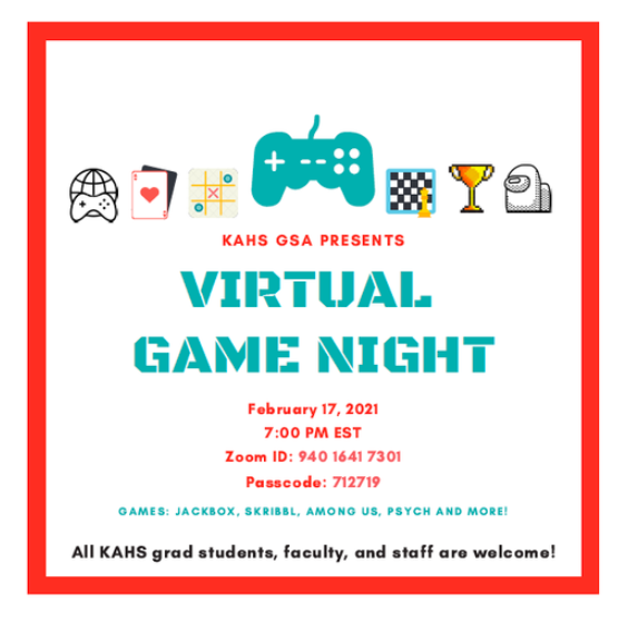 Attention all YorkU KAHS grad students, faculty, and staff! We are hosting a Virtual Game Night this week, Wednesday February 17, 2021 at 7:00pm EST. All YorkU KAHS grad students, faculty, and staff are welcome to join. We hope to see you there!
